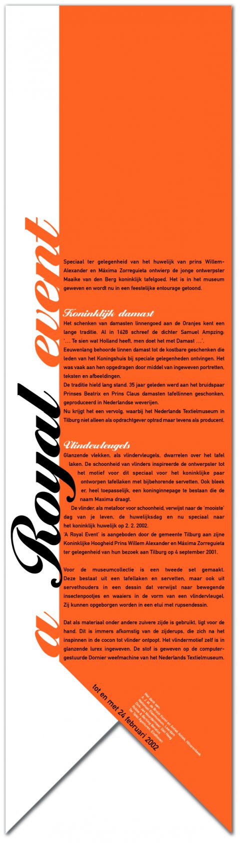 De banner bij de tentoonstelling A Royal Event geeft uitleg over een presentatie van koninklijk gedekte tafels met bijbehorende damasten.