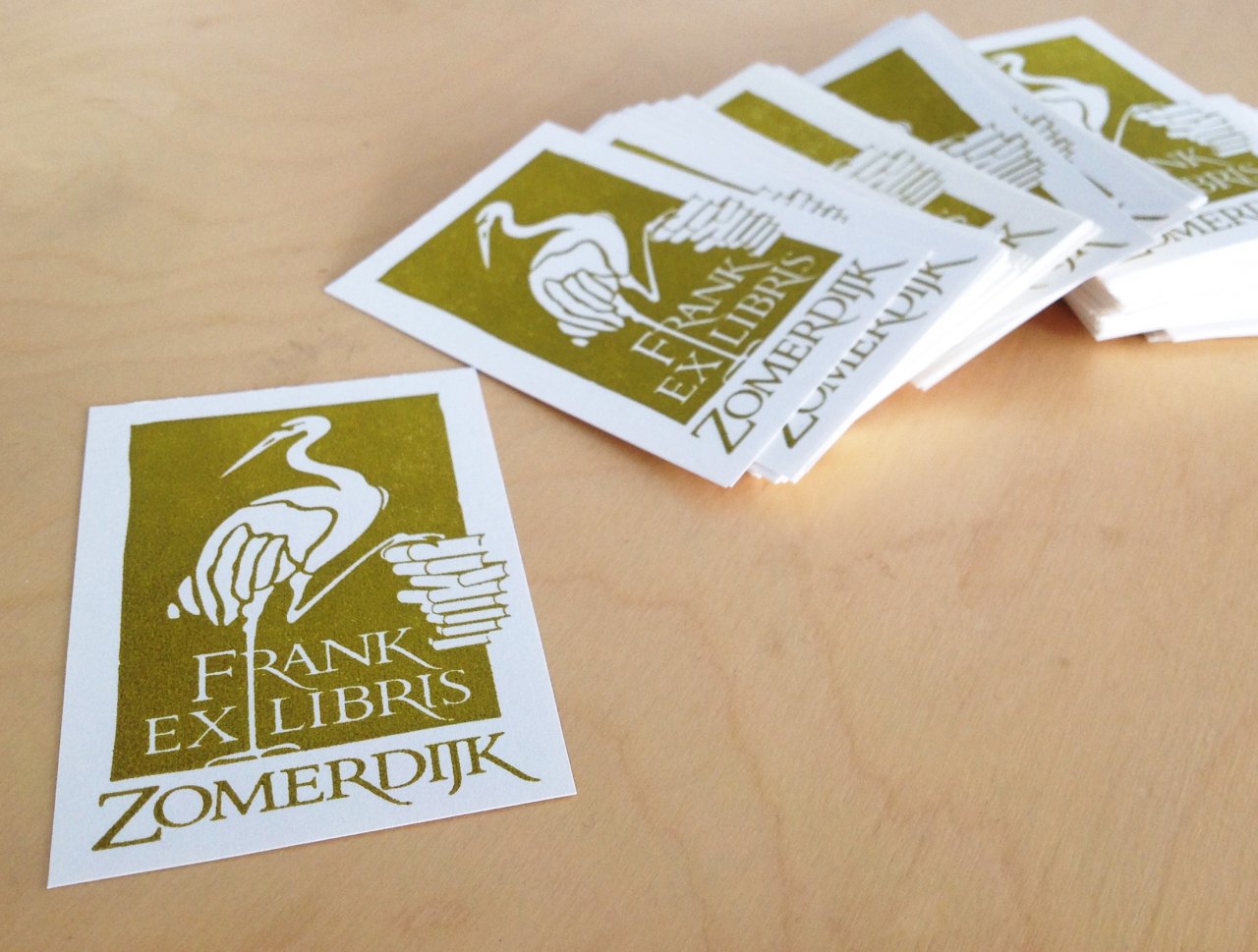Het met de hand getekende ontwerp is gedigitaliseerd waarna er een cliché van is gemaakt. Gedrukt in één drukgang, in diverse tinten goudgeel (licht en donker) en op diverse tinten papier. Hierdoor is er voor iedere boek, oud en nieuw en voor ieder schutvel een passend Ex Libris.