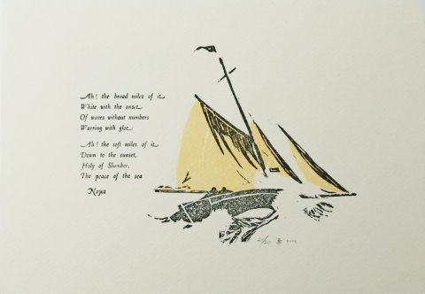 De afbeelding is een linosnede in twee kleuren, niet van een zeilschip uit de tijd van Drake, maar zoals ze in de tijd van publicatie overal rond de Engelse kusten voeren. Met een stevige wind en golfslag. Romantiek van de zee is van alle tijden...