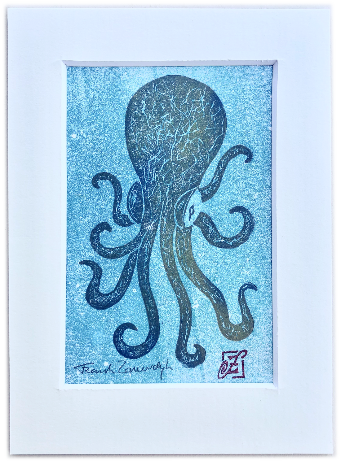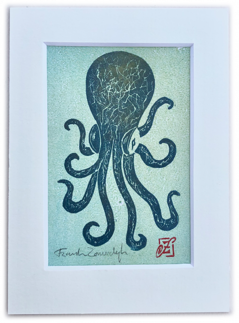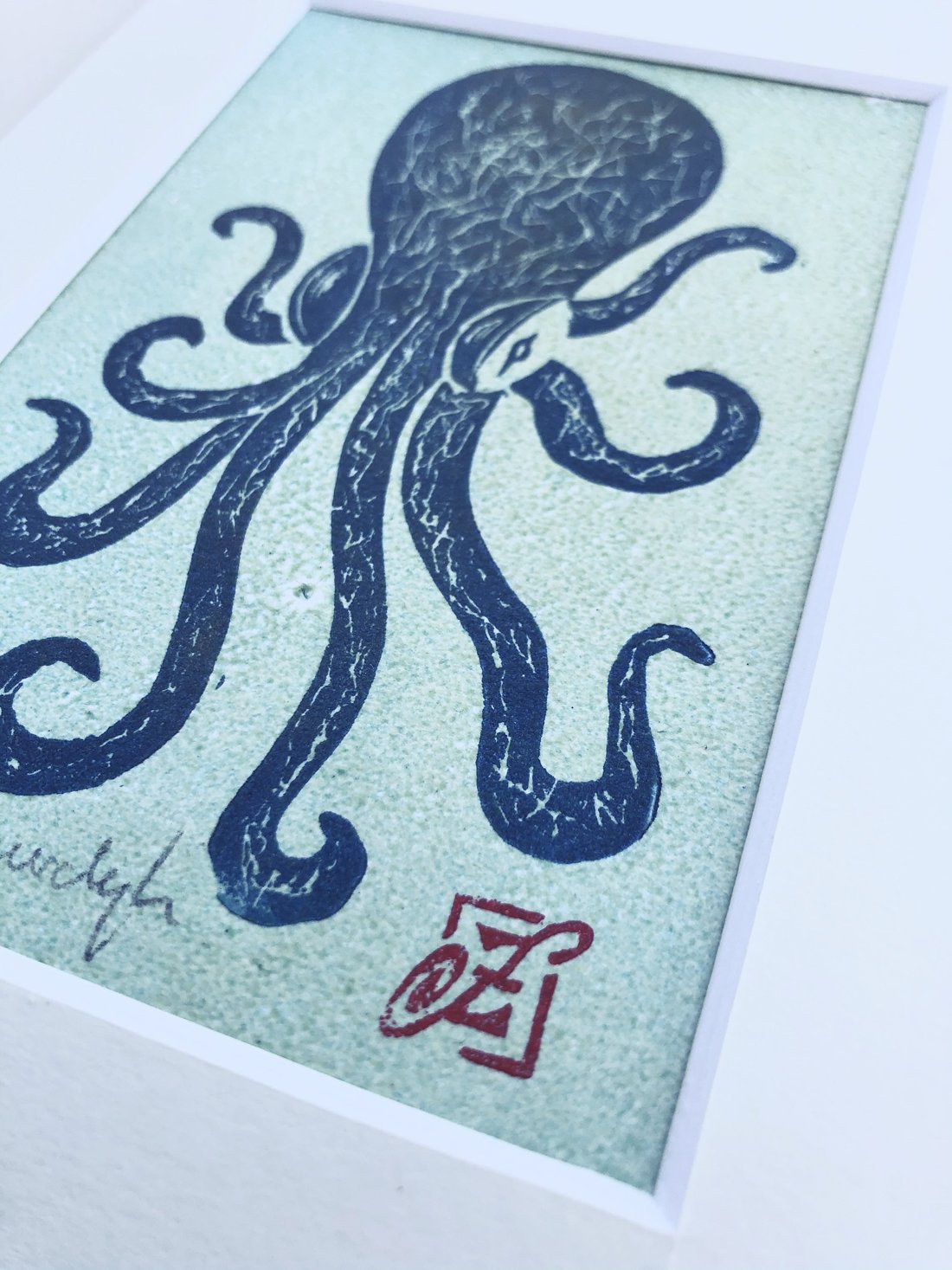 Deze kleine linosnede is gedrukt in blauw op een vooraf geprepareerde achtergrond. Met een inktroller is het papier geïnkt in verschillende tinten blaauw-groen. Iedere achtergrond is dus uniek. De octopus is na het drukken spaarzaam met goudpoeder ingewreven.