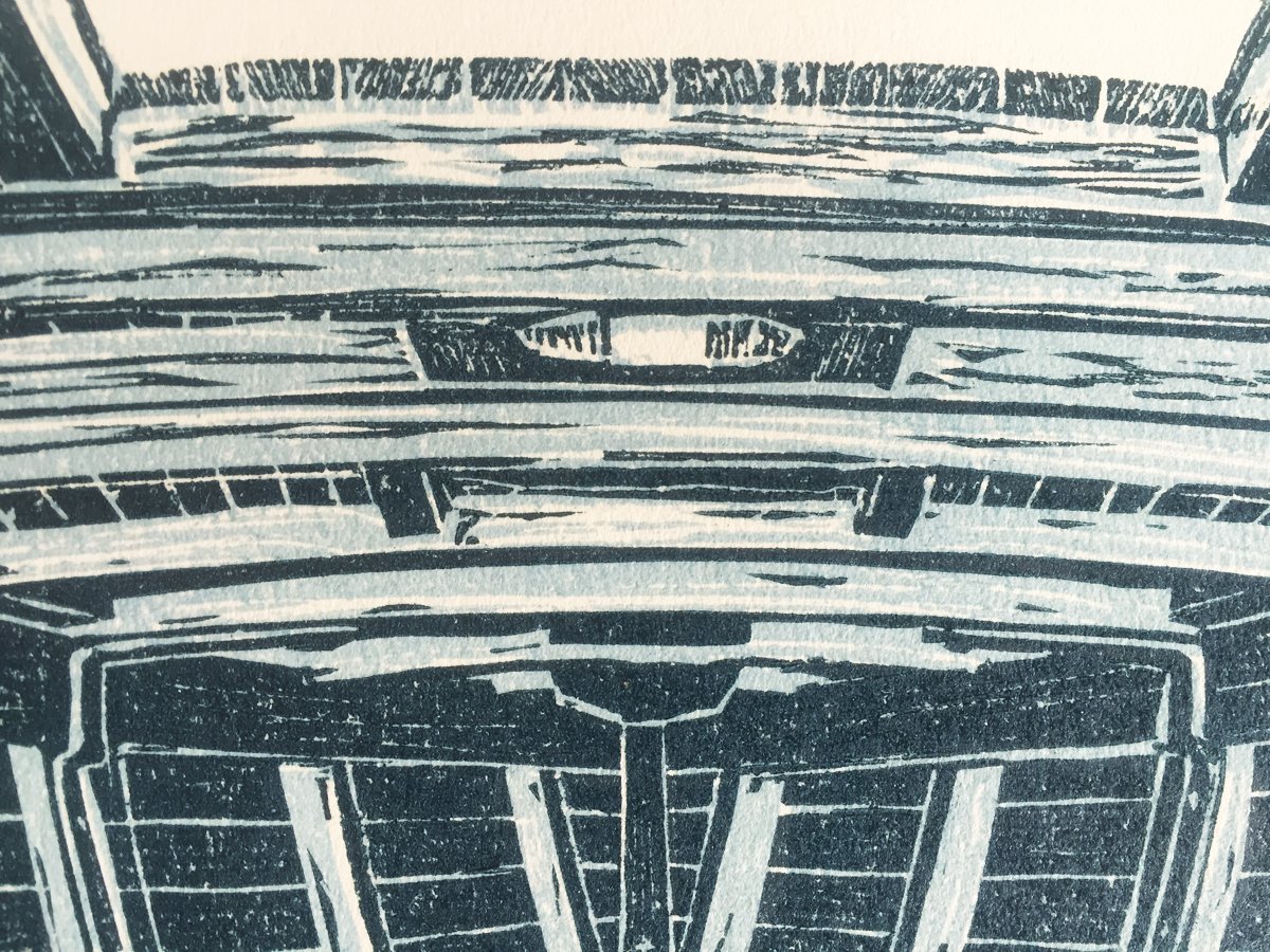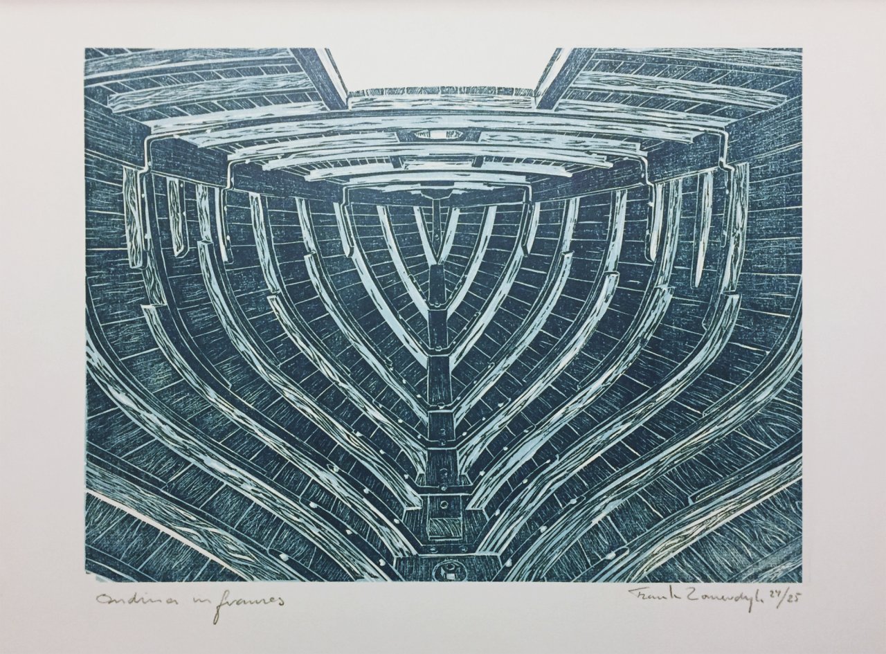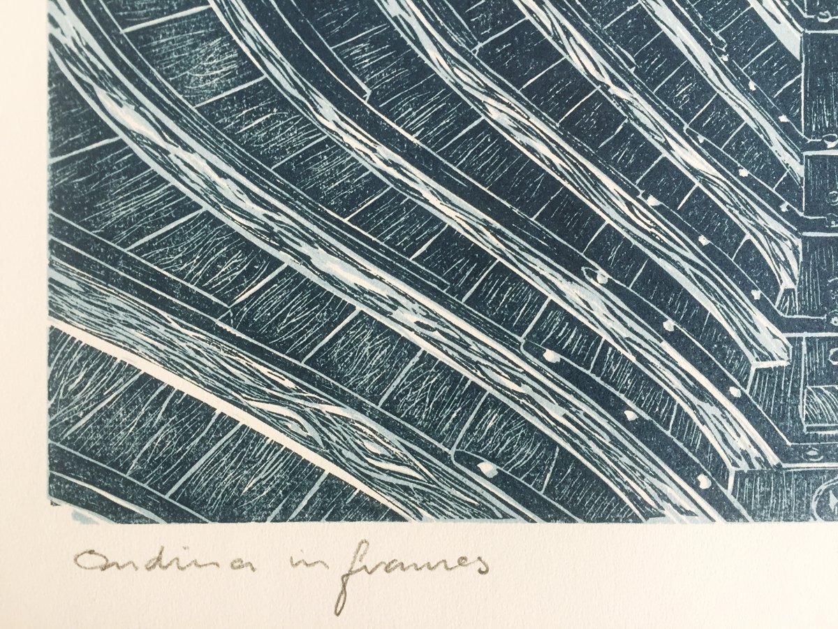 Deze grote linosnede (34 x 25)is in twee kleuren gedrukt en toont het ritme van spanten van een klassiek zeiljacht genaamd Ondina. De voorgrond vol details laat het goed de constructie en vorm van een houten schip zien.