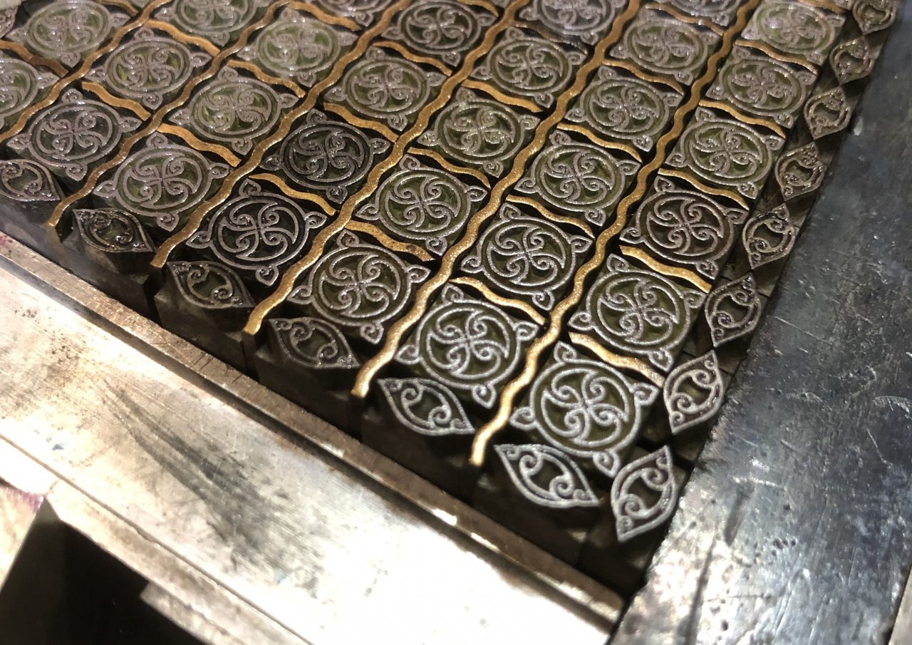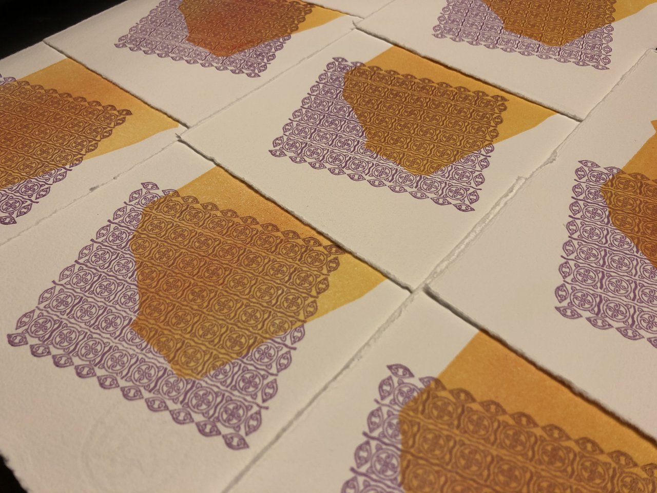 Driekleurendruk met linosnedes en loden ornamenten gecombineerd. De achtergrond heeft een lichte verlooptint van warm geel naar oranje.