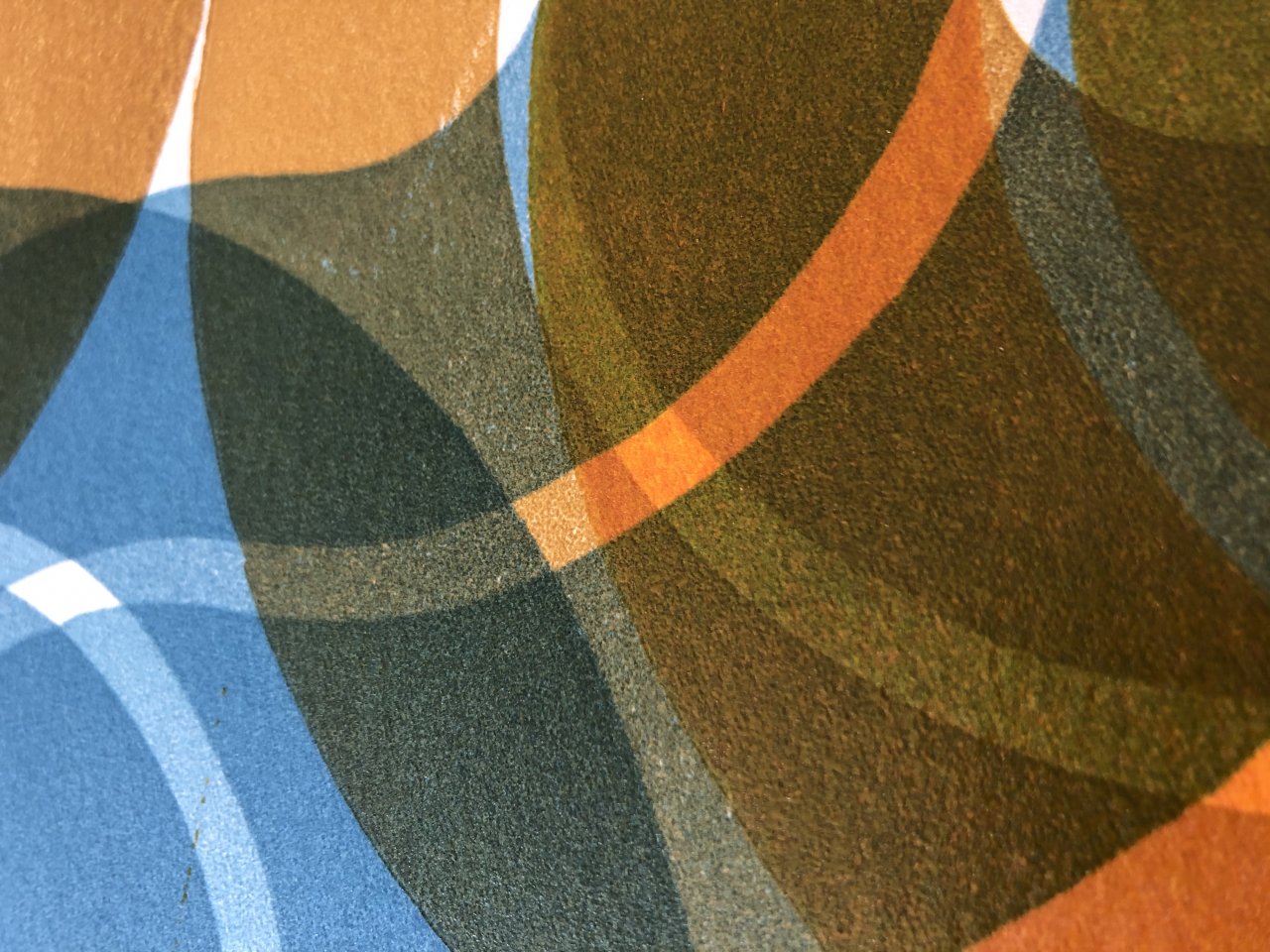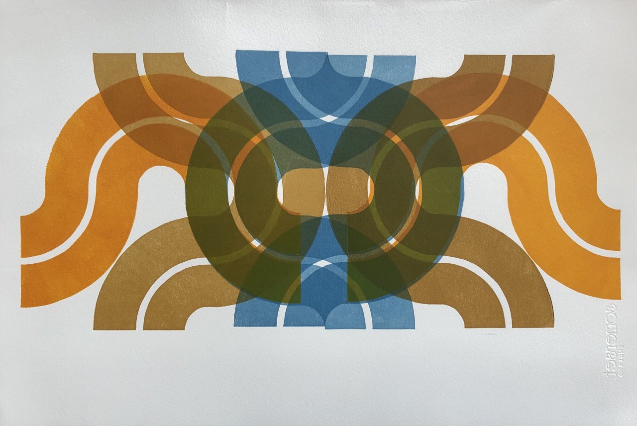 Een groot ontwerp gedrukt met slechts één linosnede. Dit is er een in een serie waarin ik de mogelijkheden heb verkend om nieuwe beelden te creëren met slechts één simpele basisvorm.